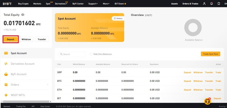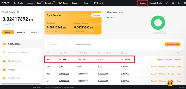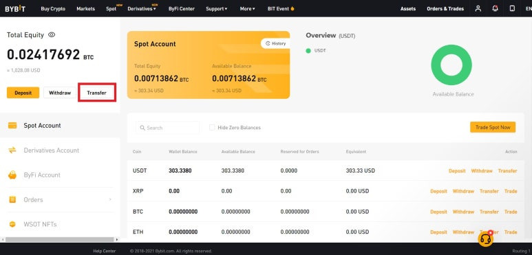 바이비트에 코인을 입금했으면, 이제 선물거래를 위해 현물계정에 있는 코인을 선물계정으로 옮겨야 합니다.