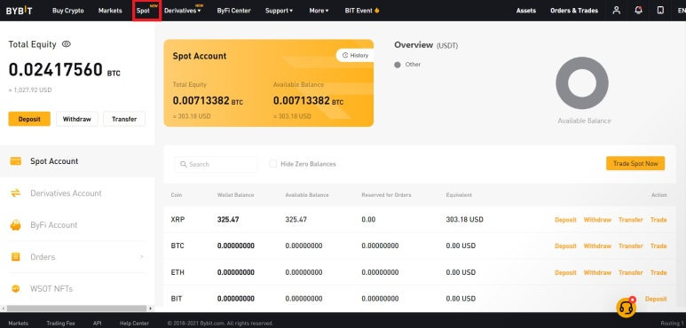 - 바이비트에서 상단 메뉴 중 Spot 클릭