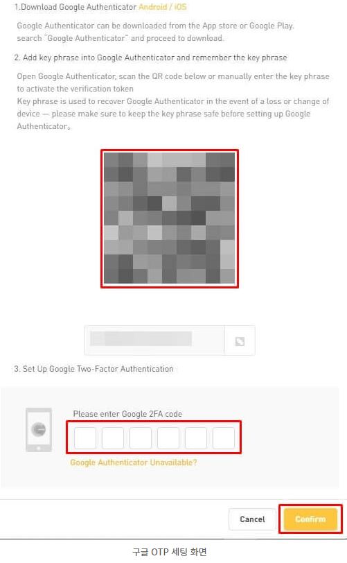 - 앱에 6자리 숫자 코드가 생성되면, 다시 PC로 돌아와 Set Up Google Two-Factor Authentication 창 하단에 코드 입력 → Confirm 클릭