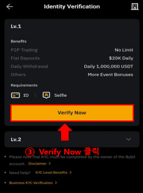 바이비트 KYC 인증을 하려면 홈페이지에서 나의 프로필로고 처럼 나와있는 사람 모양을 클릭해주세요. 클릭해주시구 신원인증이라는 곳에 들어가주세요! 간단합니다 KYC 인증 동의하기를 눌러주세요.