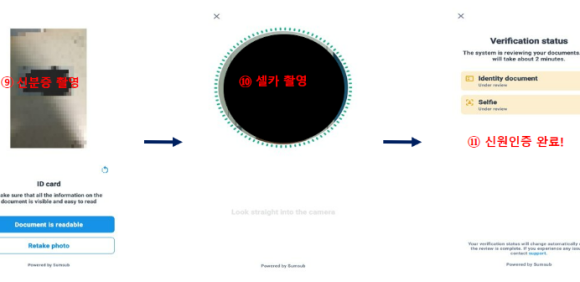마지막 단계로 셀카 사진 촬영이 있습니다. 이는 신분증 속 얼굴과 본인이 동일한지 최종 확인하는 절차이니 걱정하지 마세요!